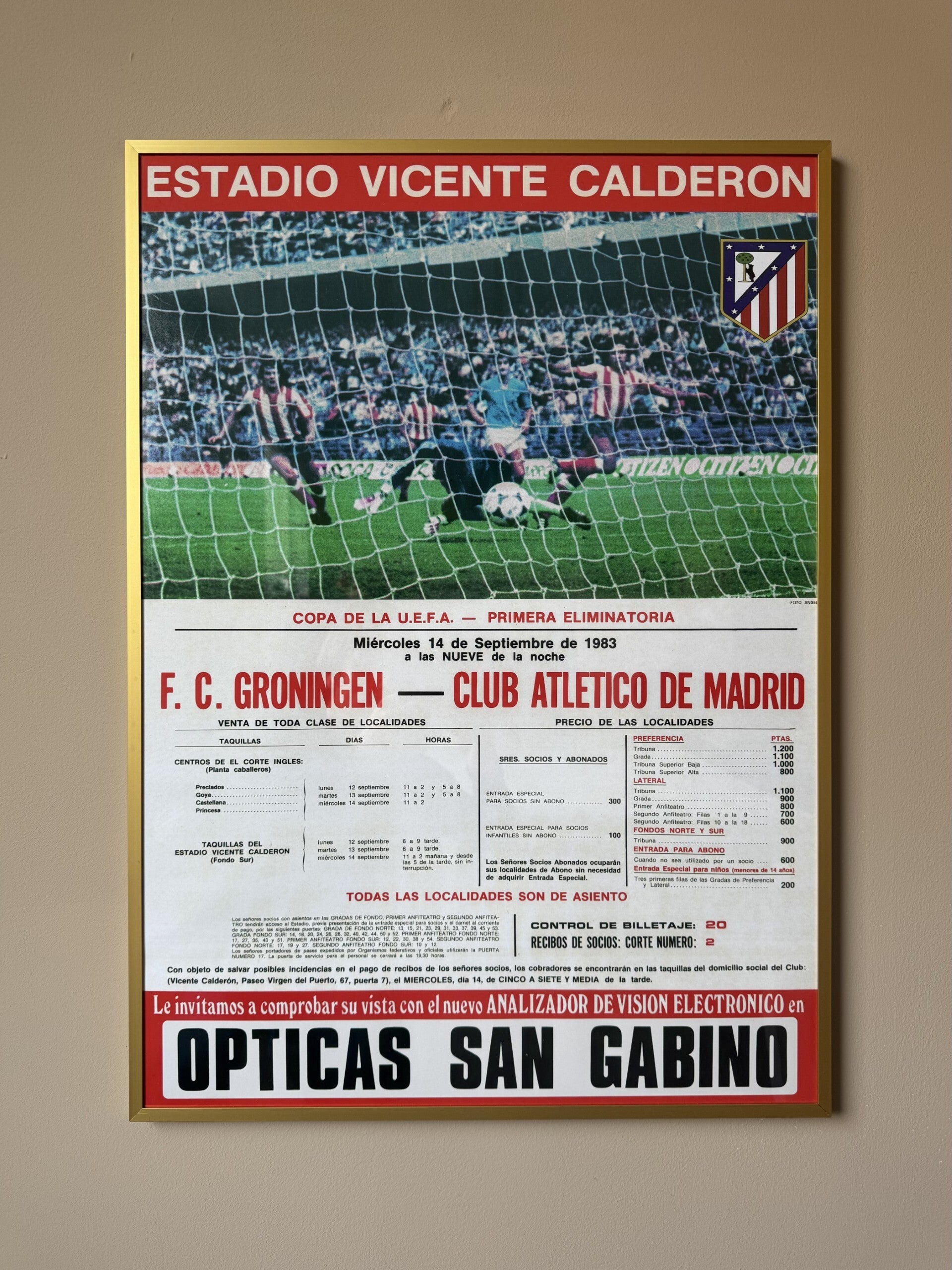 FC Groningen poster van ons allereerste duel in Europa tegen topclub Atlético Madrid. Dit prachtige Spaanse wedstrijdaffiche uit 1983 hing als vooraankondiging in Madrid.