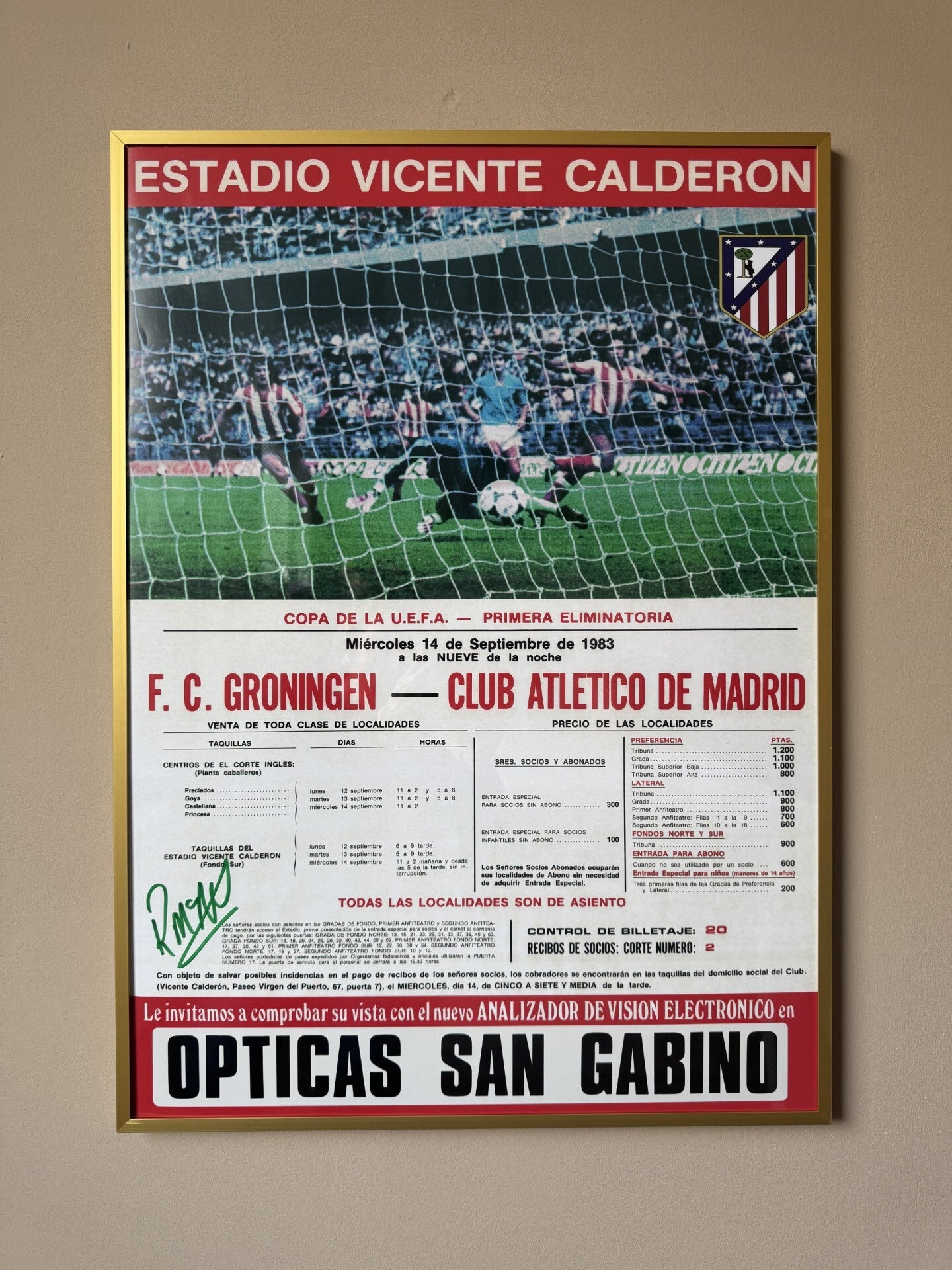 Spaanstalig wedstrijdaffiche uit 1983 van onze eerste Europese wedstrijd ooit tegen topclub Atletico Madrid.